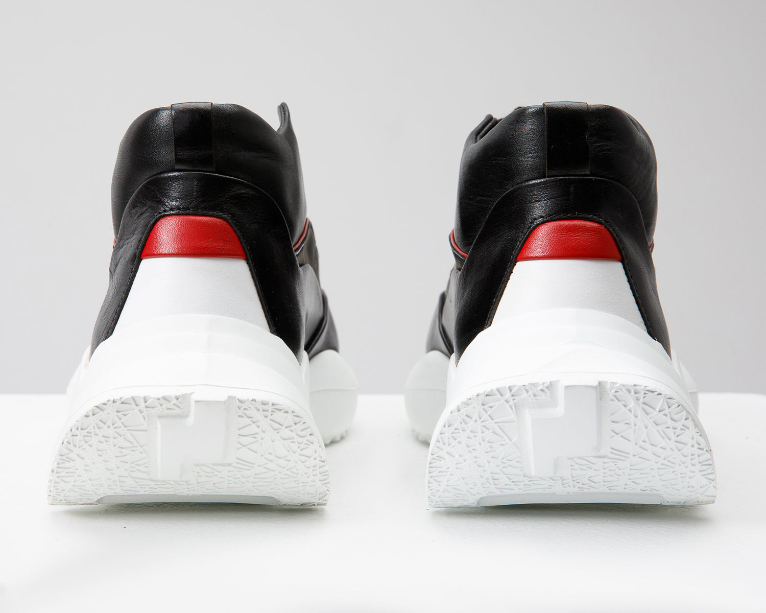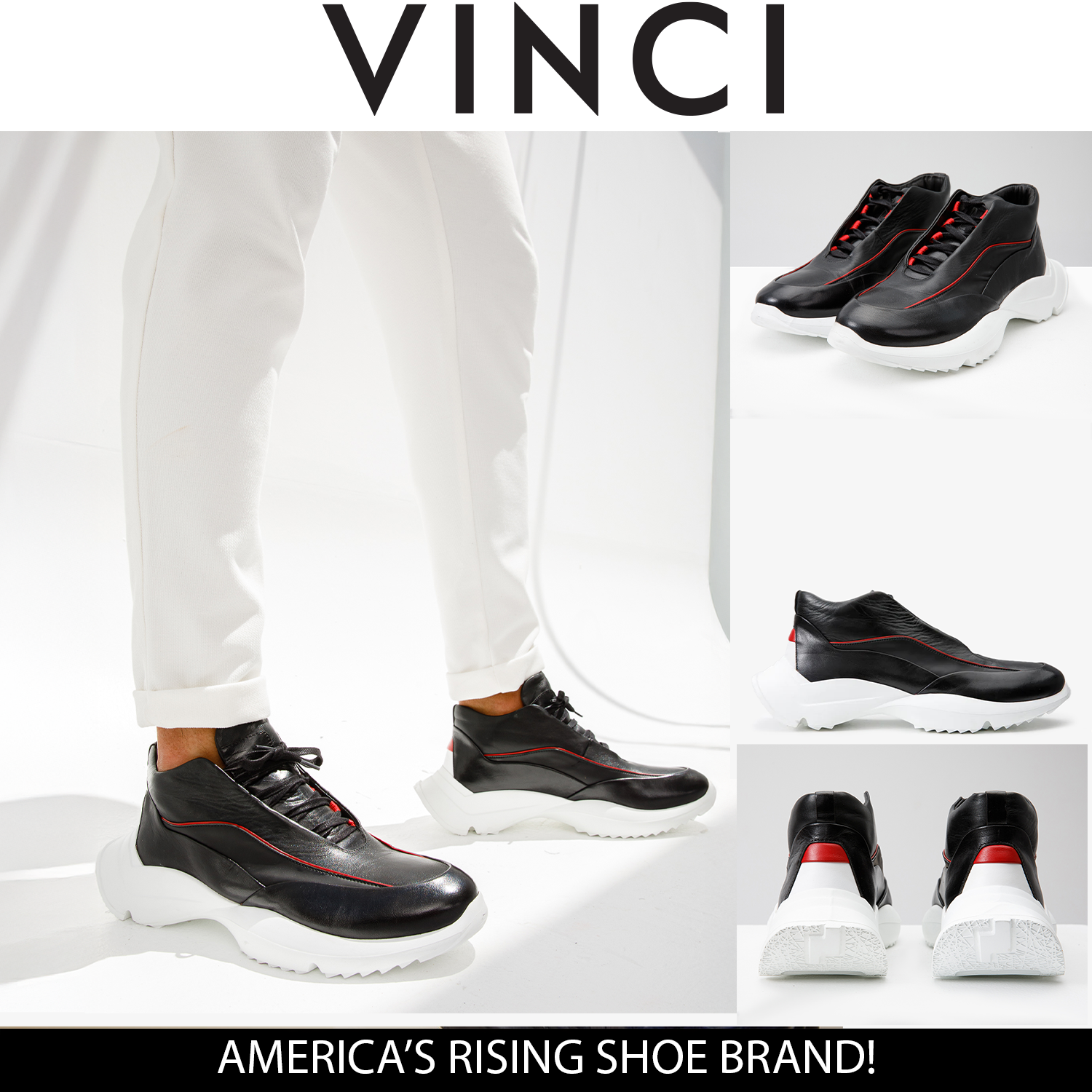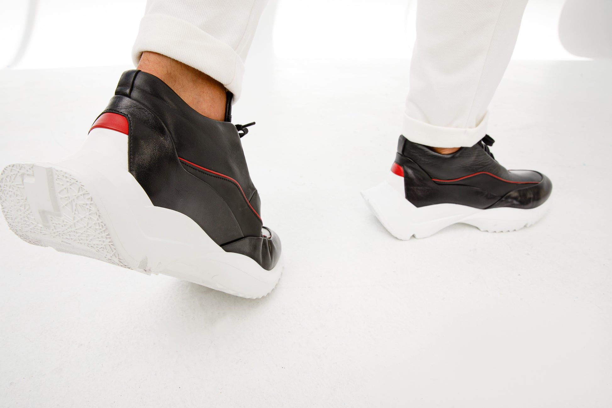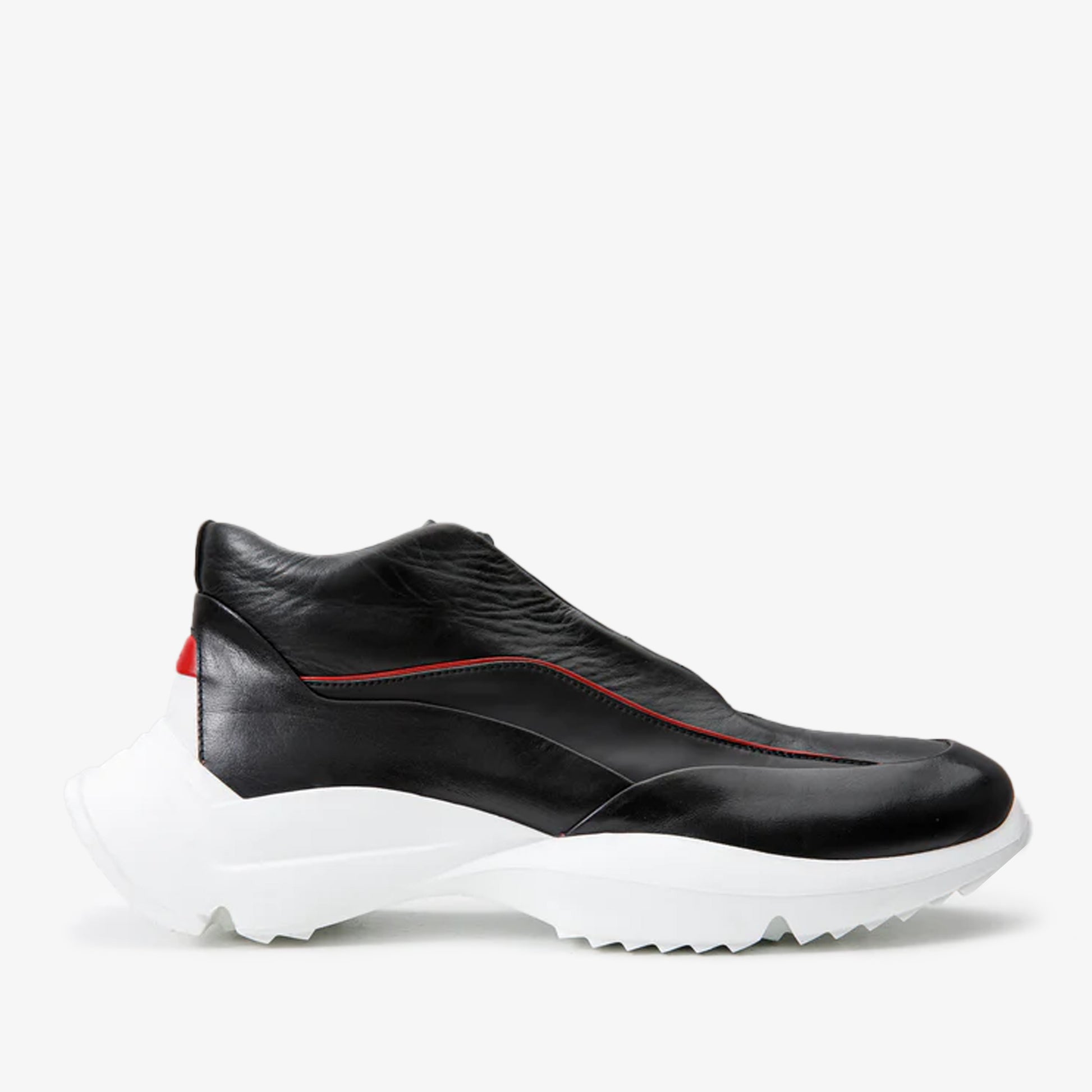 - يتميز بتفاصيل جلدية حمراء جريئة تمتد من أصابع القدم إلى الكعب، مما يخلق تصميمًا مميزًا وجذابًا للنظر.