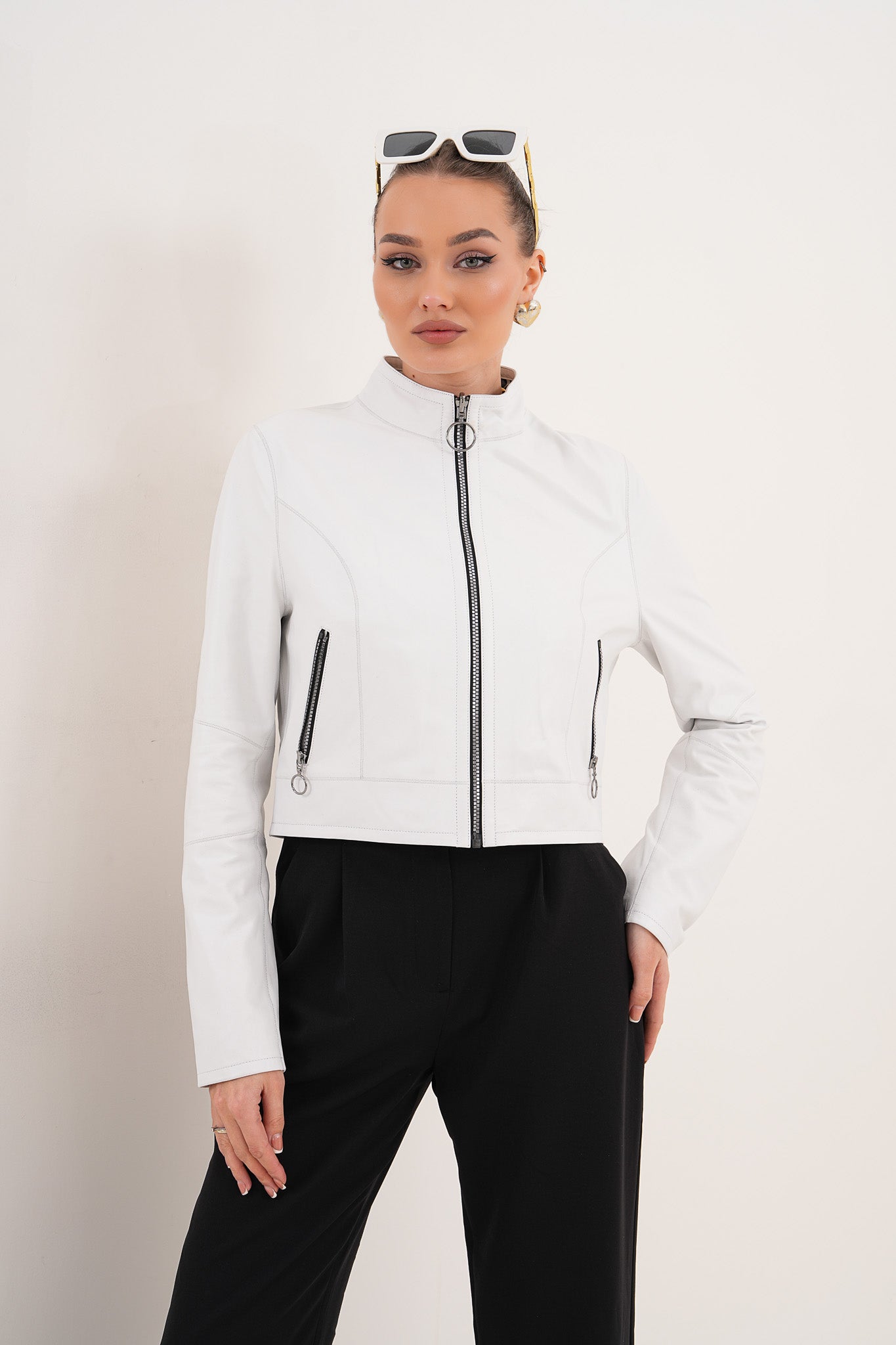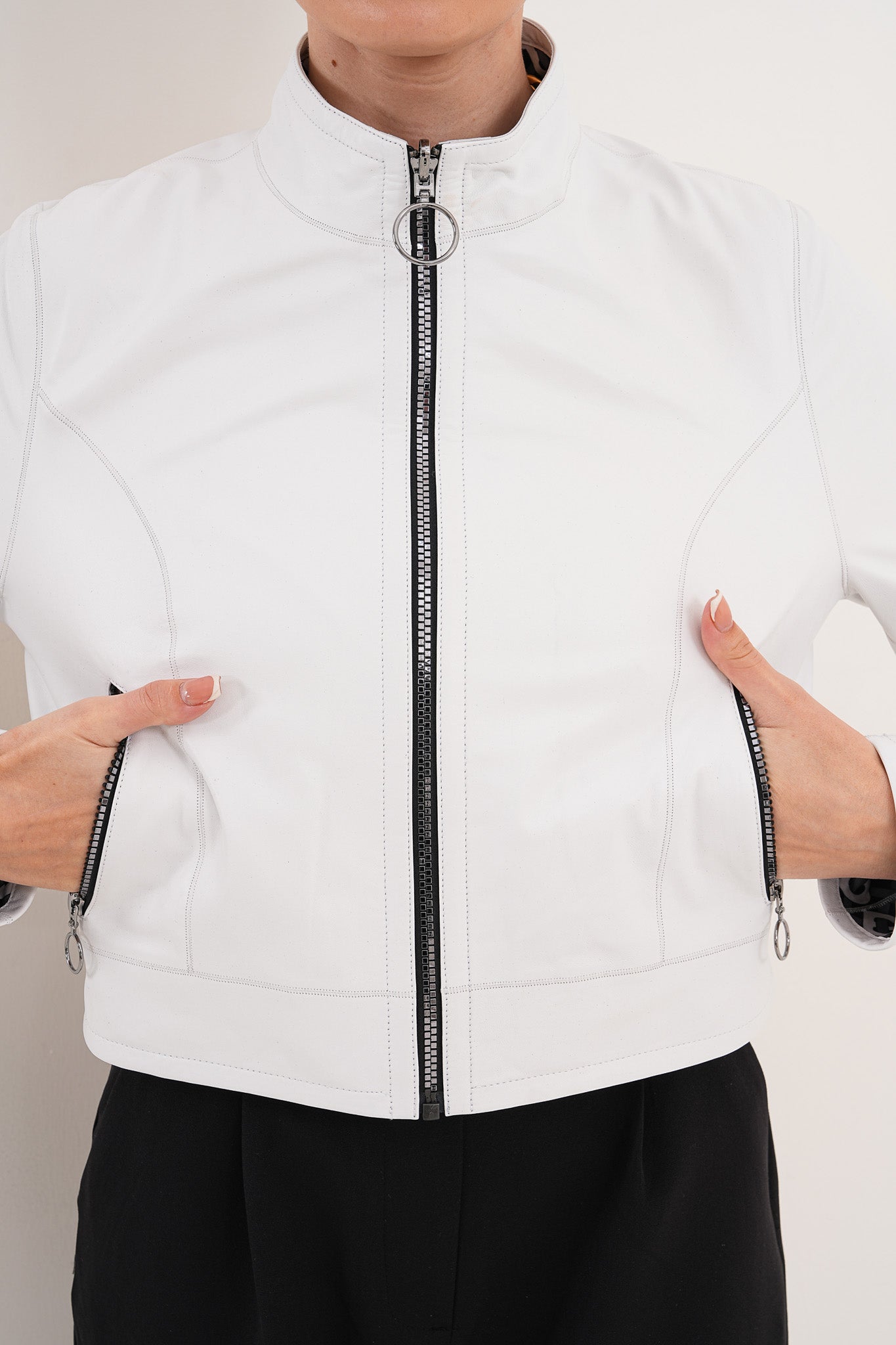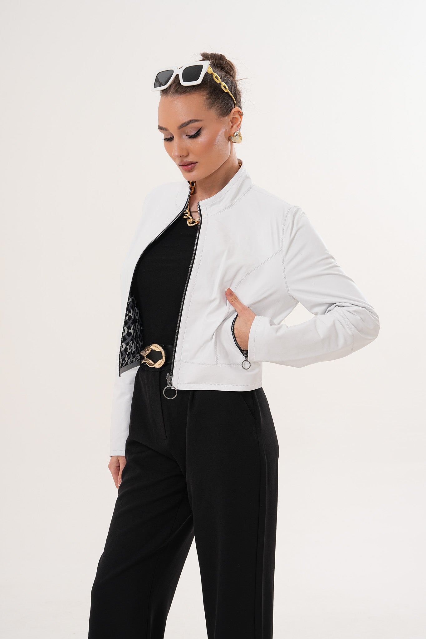 سترة Elvaris الجلدية البيضاء النسائية القابلة للارتداء من الجهتين