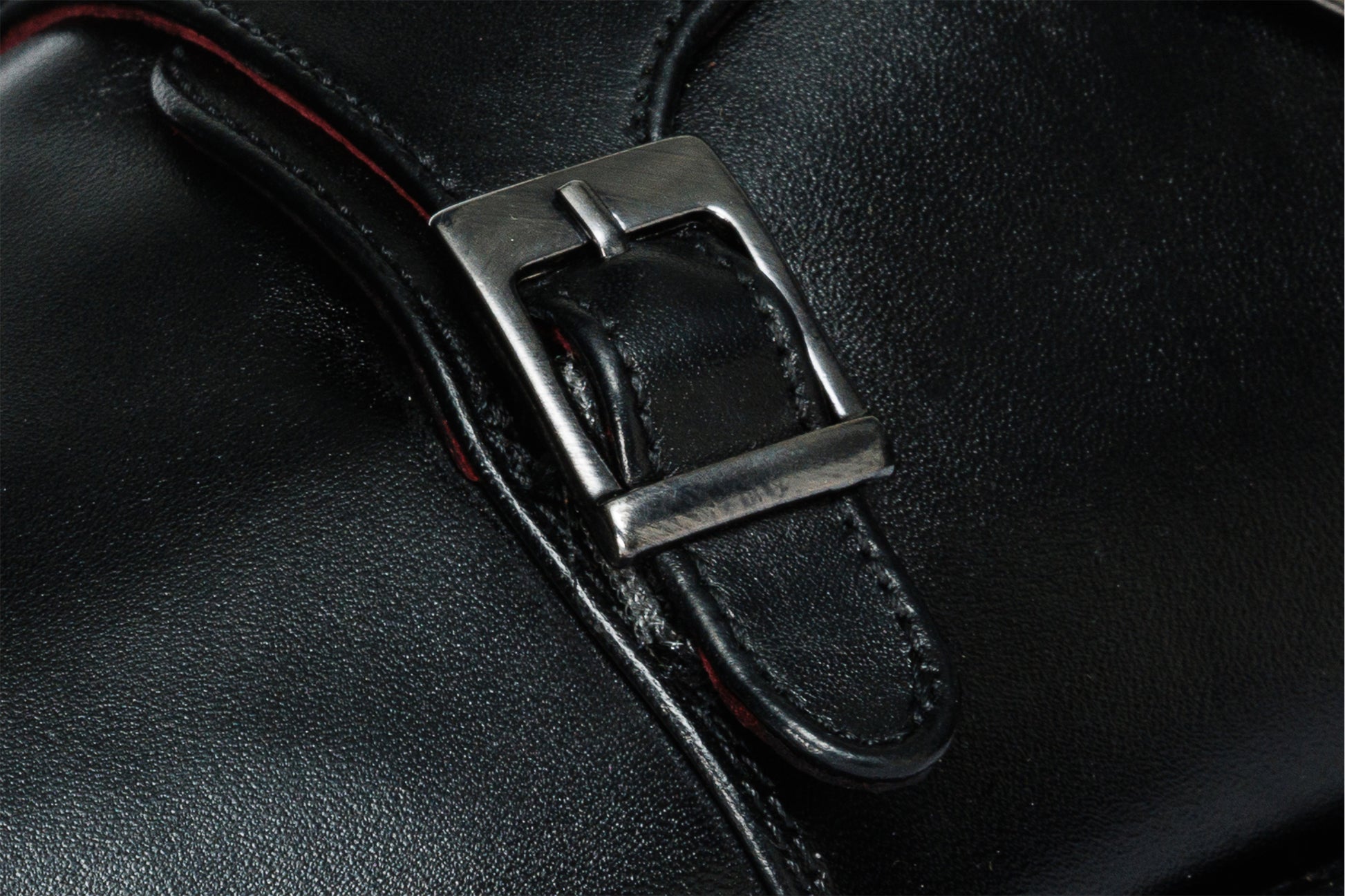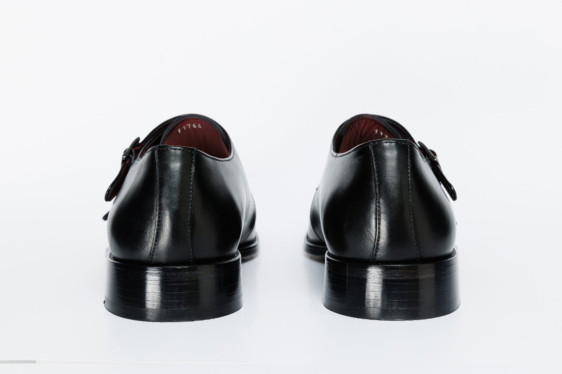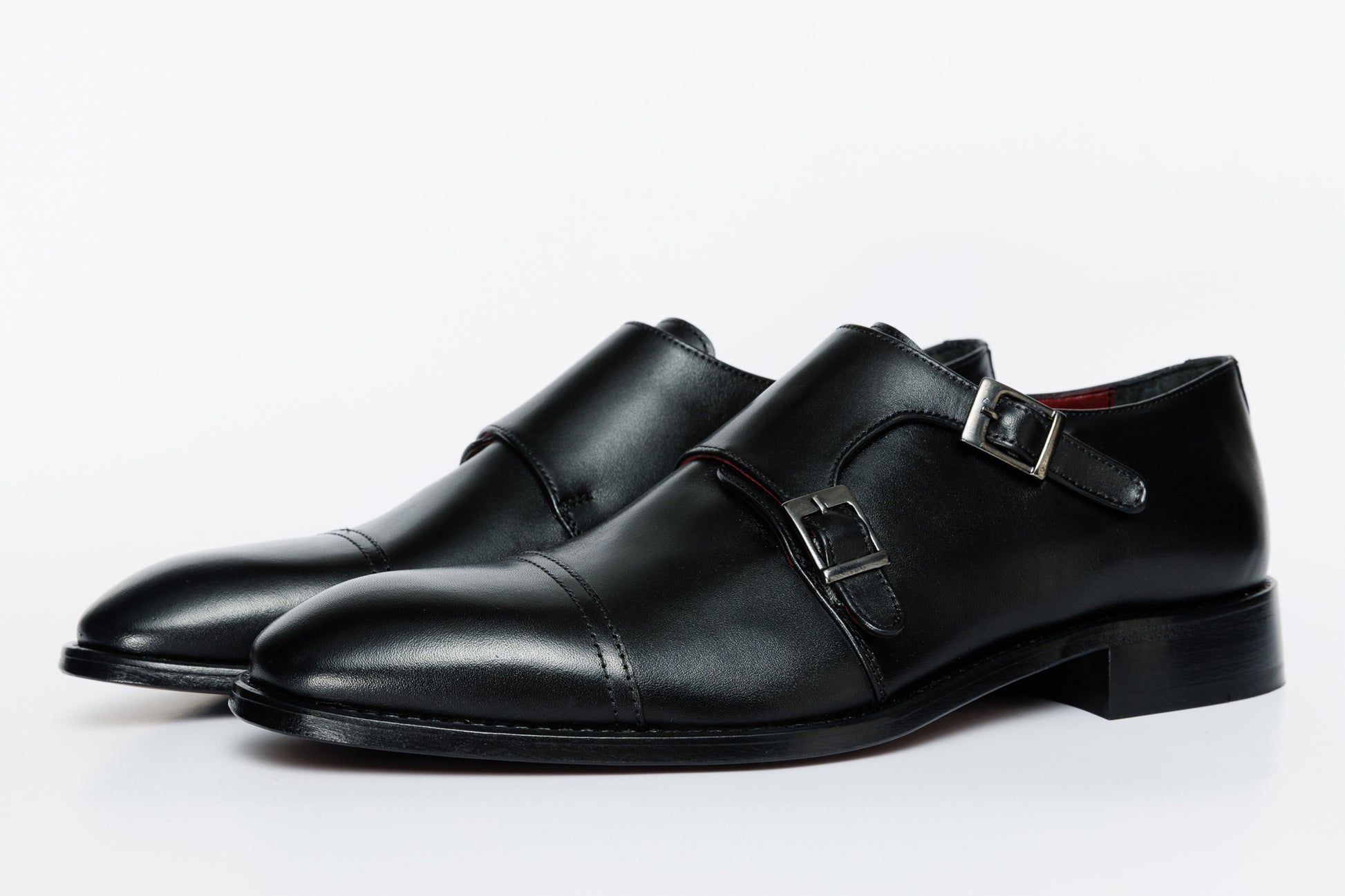 حذاء رجالي أسن من الجلد الأسود بطرف كاب وحزام مزدوج - أناقة خالدة