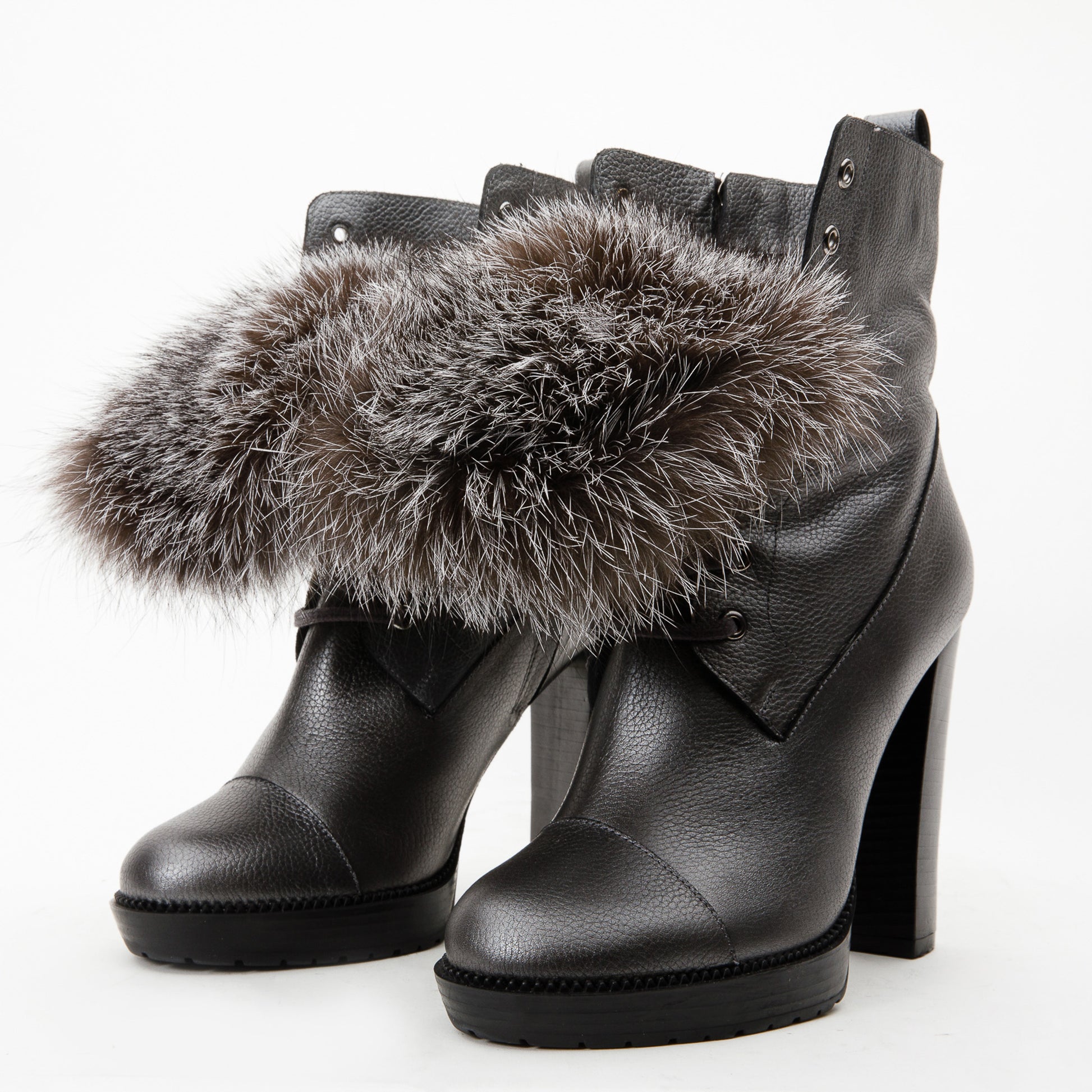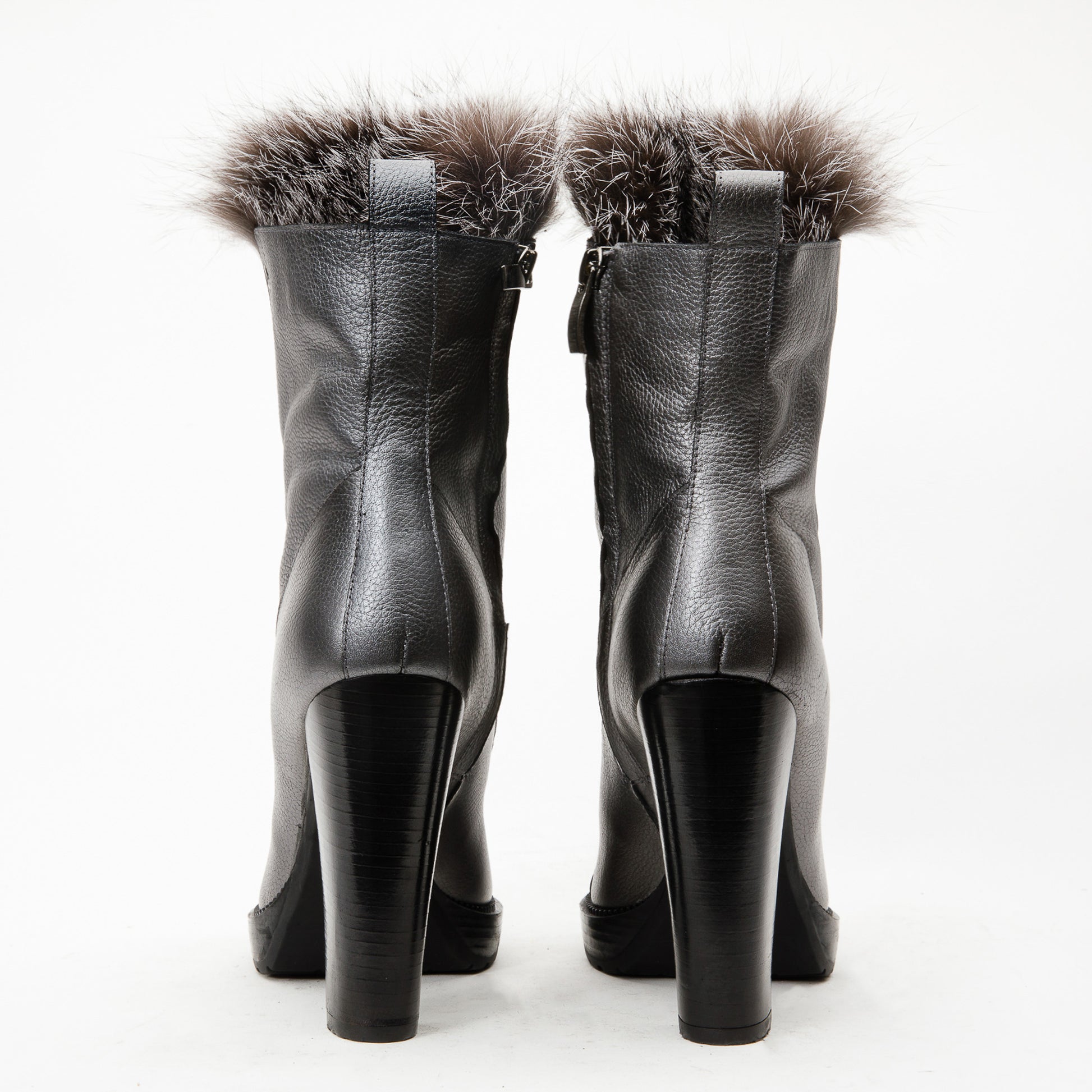بوت نسائي من ميلو، جلد فضي، فرو طبيعي، بكعب منصة، يصل إلى منتصف الساق