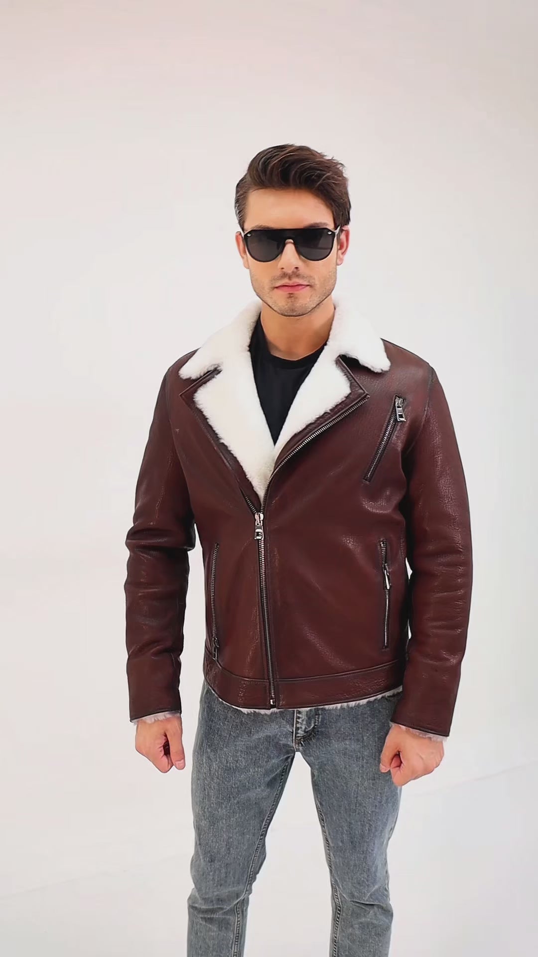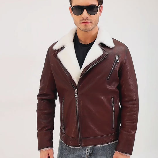 The Cortina Brown & White Shearling Leather Men Jacket blends bold design with timeless craftsmanship.
