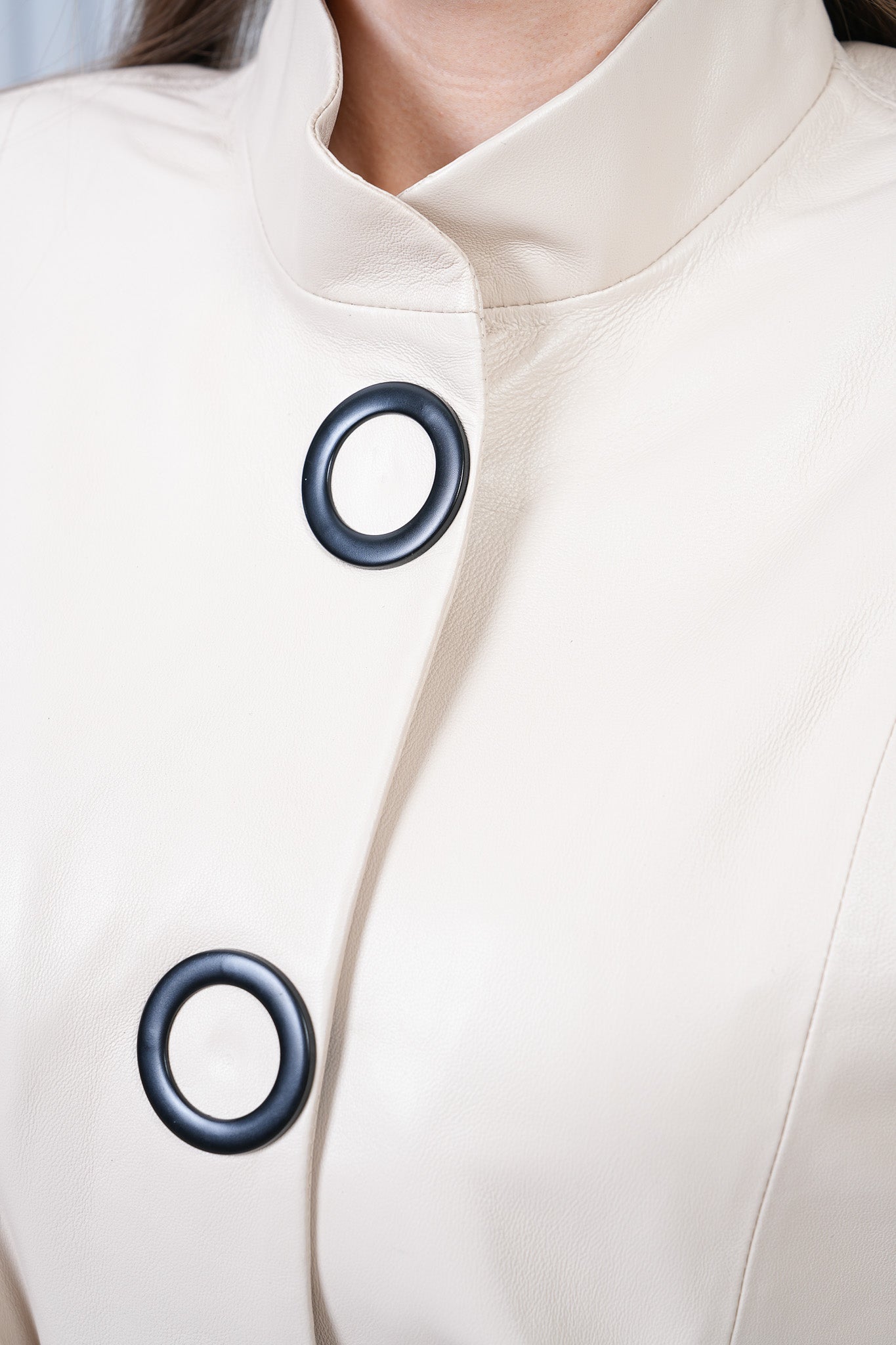 Hardware: Oversized black matte ring buttons for a bold modern accent