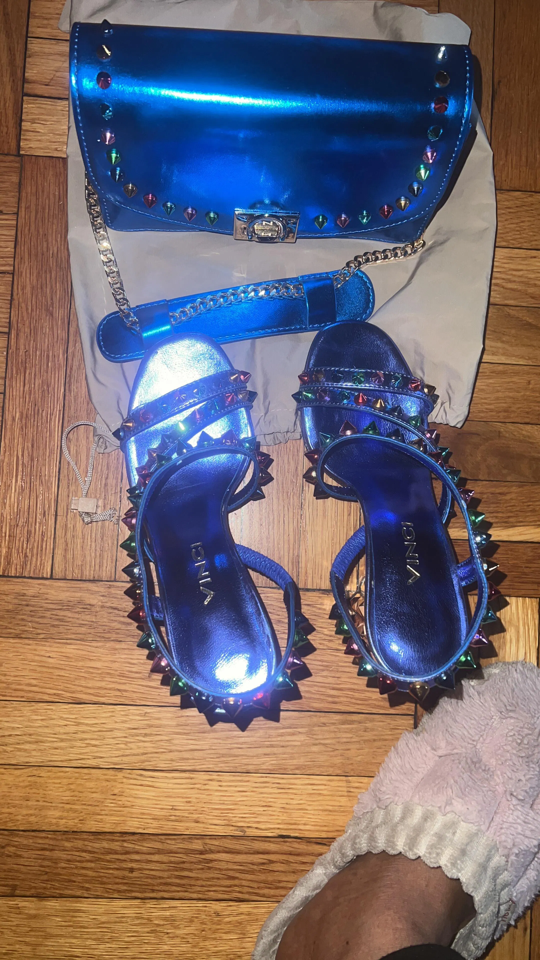 Conjunto versátil con sandalia de cuero Caris Sax de tacón bloque azul con punta de espiga: Combina tu bolso de cuero azul Caris Sax con las sandalias de tacón bloque azul Caris Sax de cuero con tachuelas para mujer, disponibles por separado, creando un conjunto coordinado que irradia confianza y estilo.