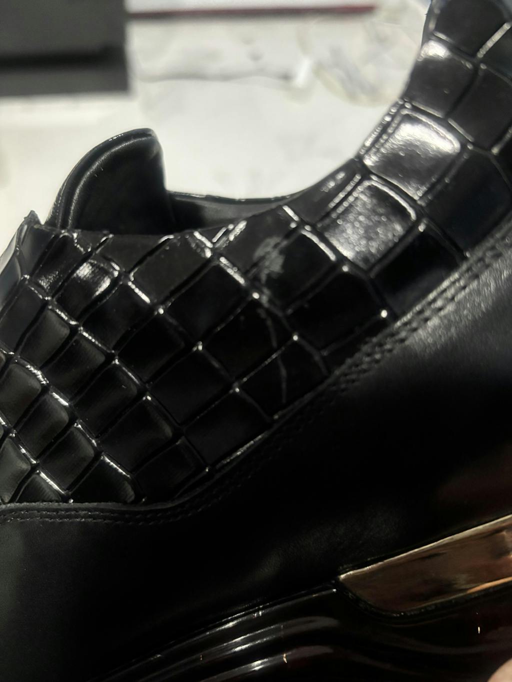 - Cuenta con un detalle único de cuero con estampado de cocodrilo en la parte superior, que añade un toque exótico y sofisticado