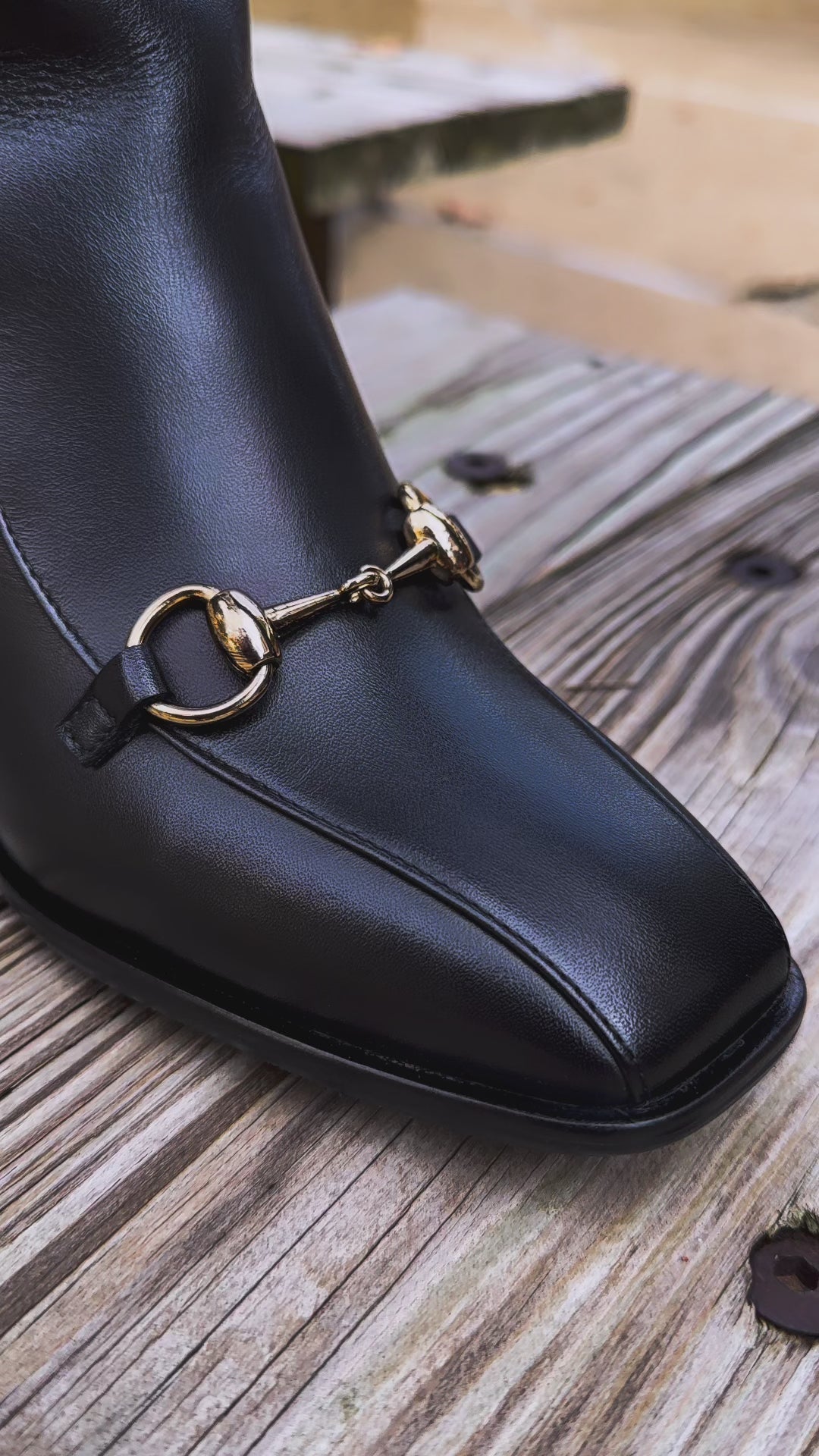 - Sumérgete en el lujo con nuestra bota Bukres de tacón bloque de cuero negro, meticulosamente elaborada a mano con cuero 100% premium.