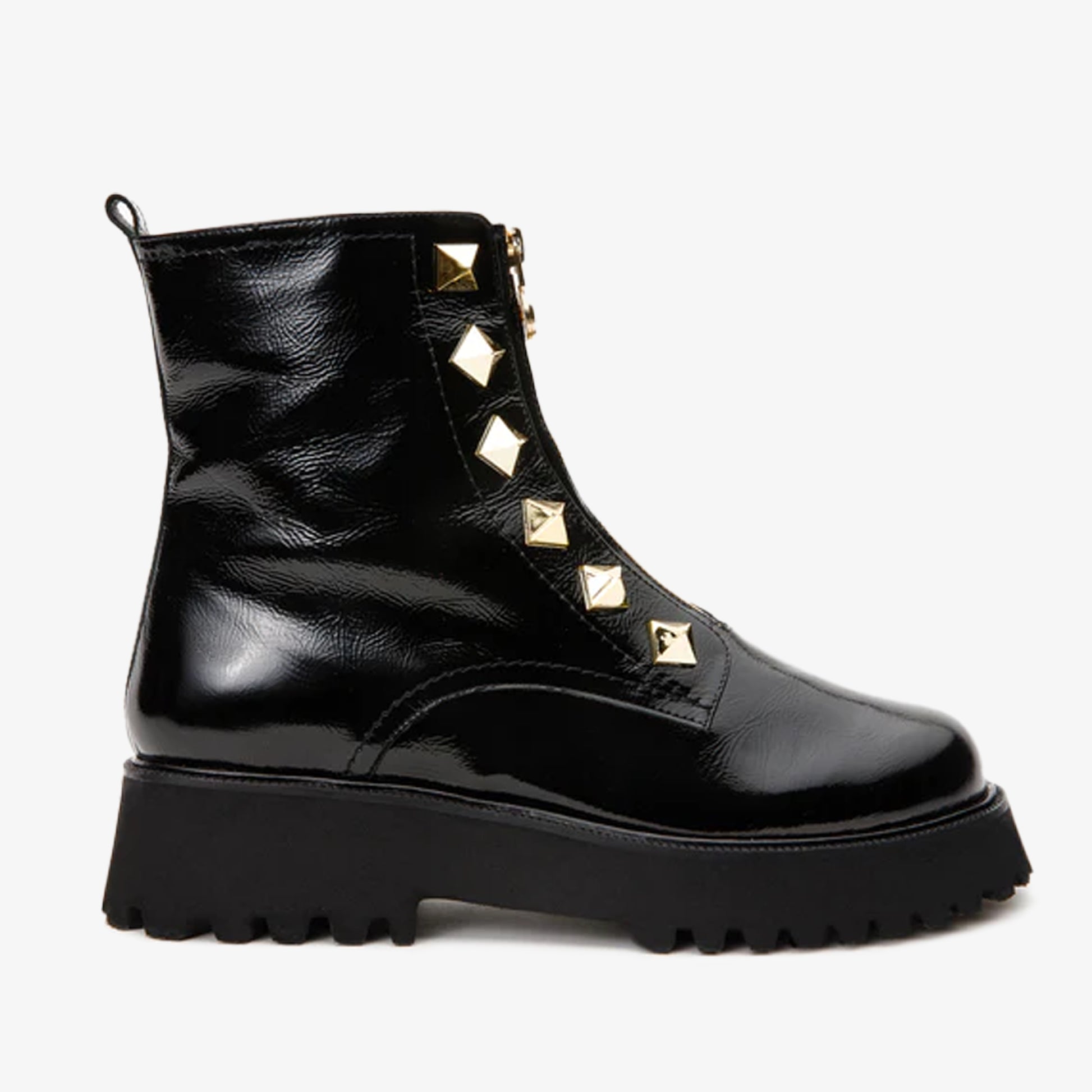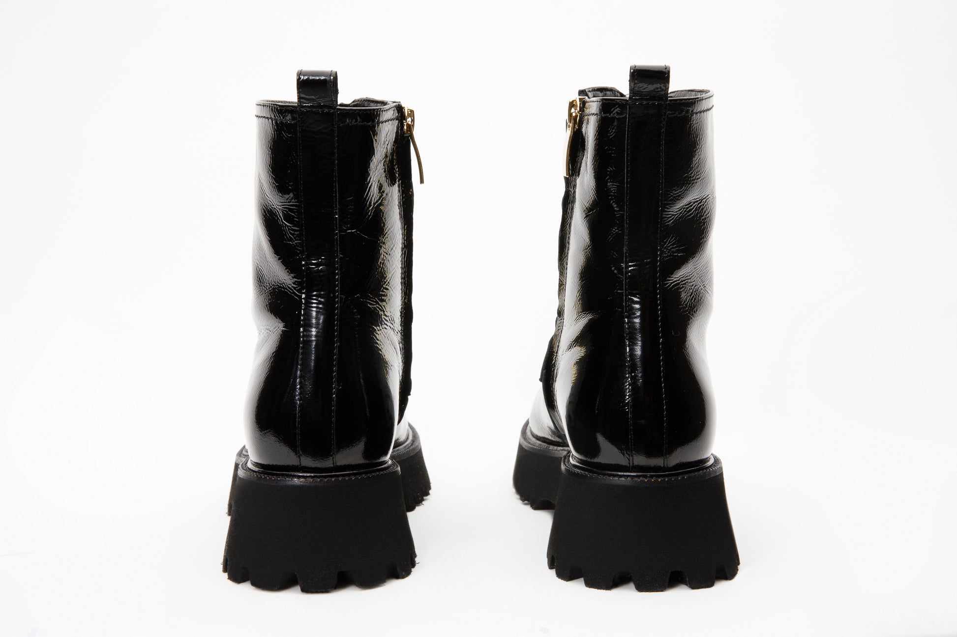Eleve su estilo con las botas hasta el tobillo de piel patentada negra Ottawa para mujer, donde la sofisticación se combina con la comodidad en cada paso.