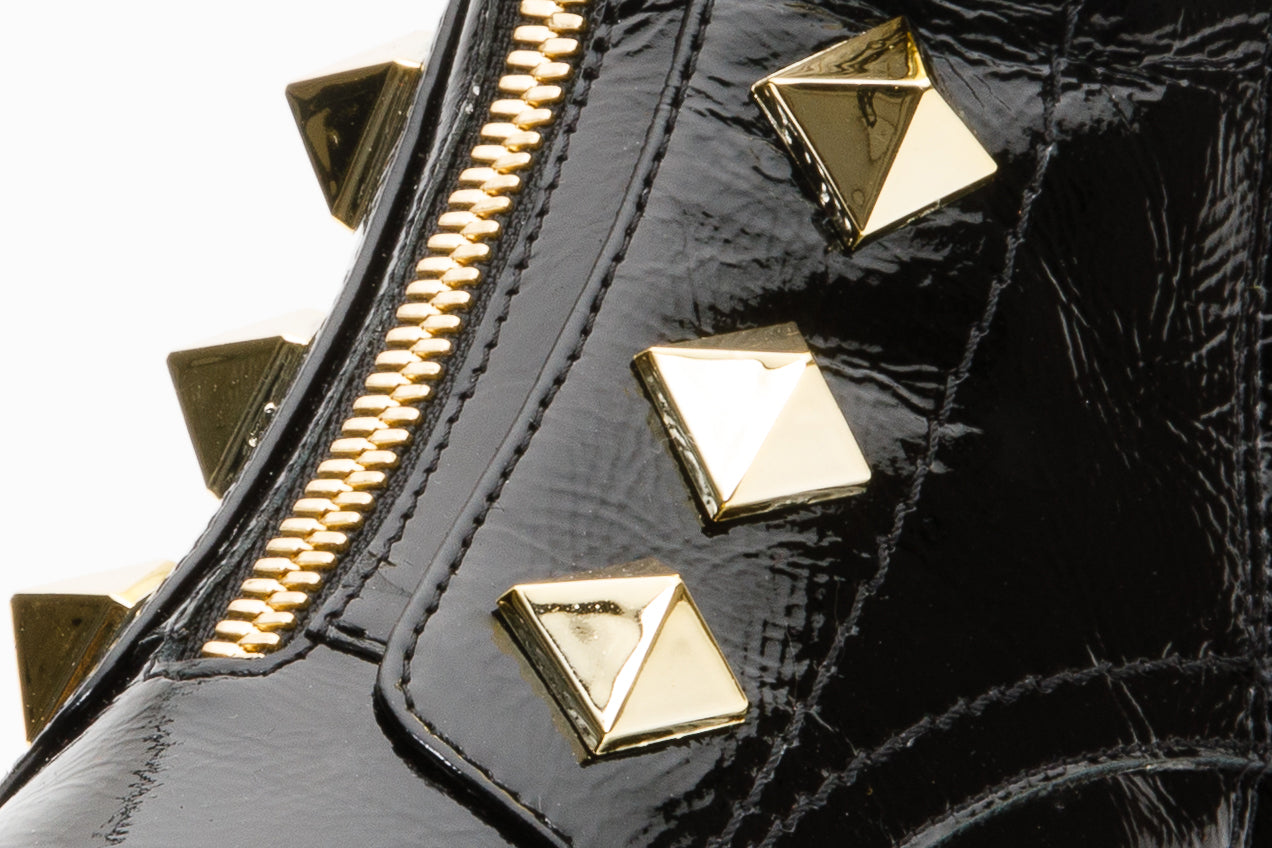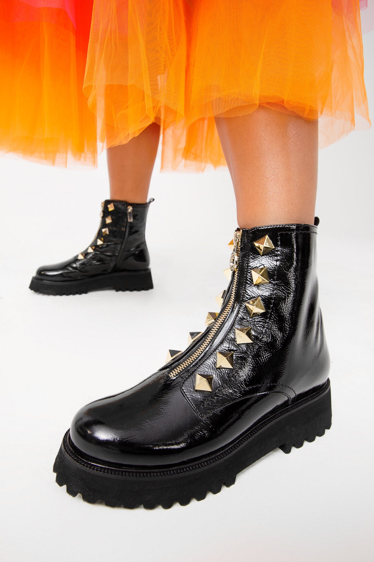 Elegancia artesanal: deléitese con el lujo con las botas hasta el tobillo para mujer de charol negro Ottawa, meticulosamente elaboradas a mano con 100 % cuero de vaca de primera calidad.