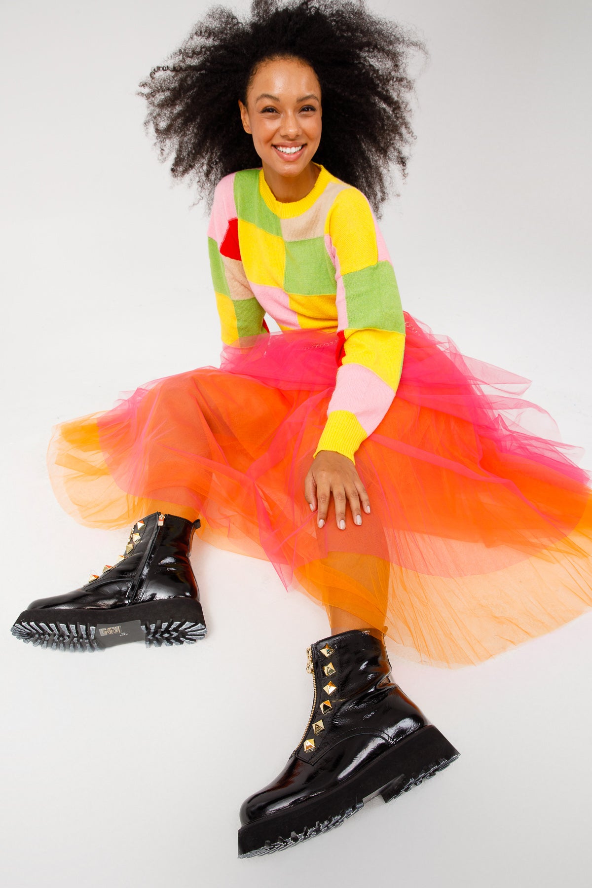 Acentos dorados con borde: el frente cuenta con una cremallera dorada puramente por diseño, flanqueada por audaces púas doradas a cada lado, creando una estética armoniosa y vanguardista.