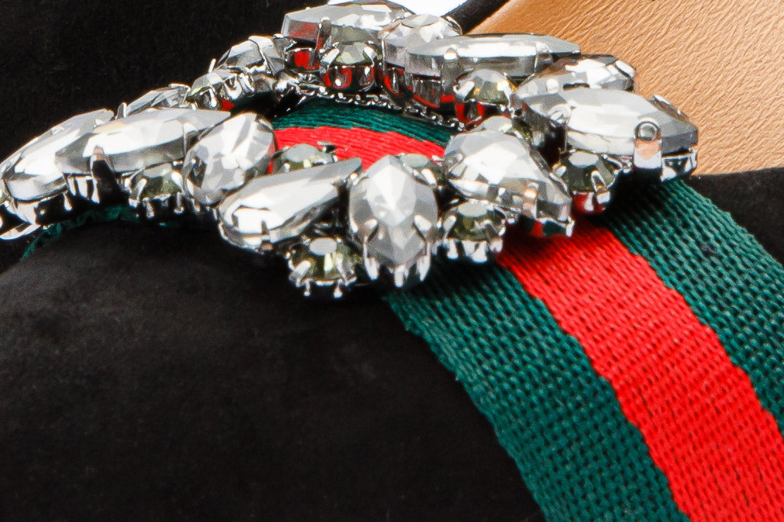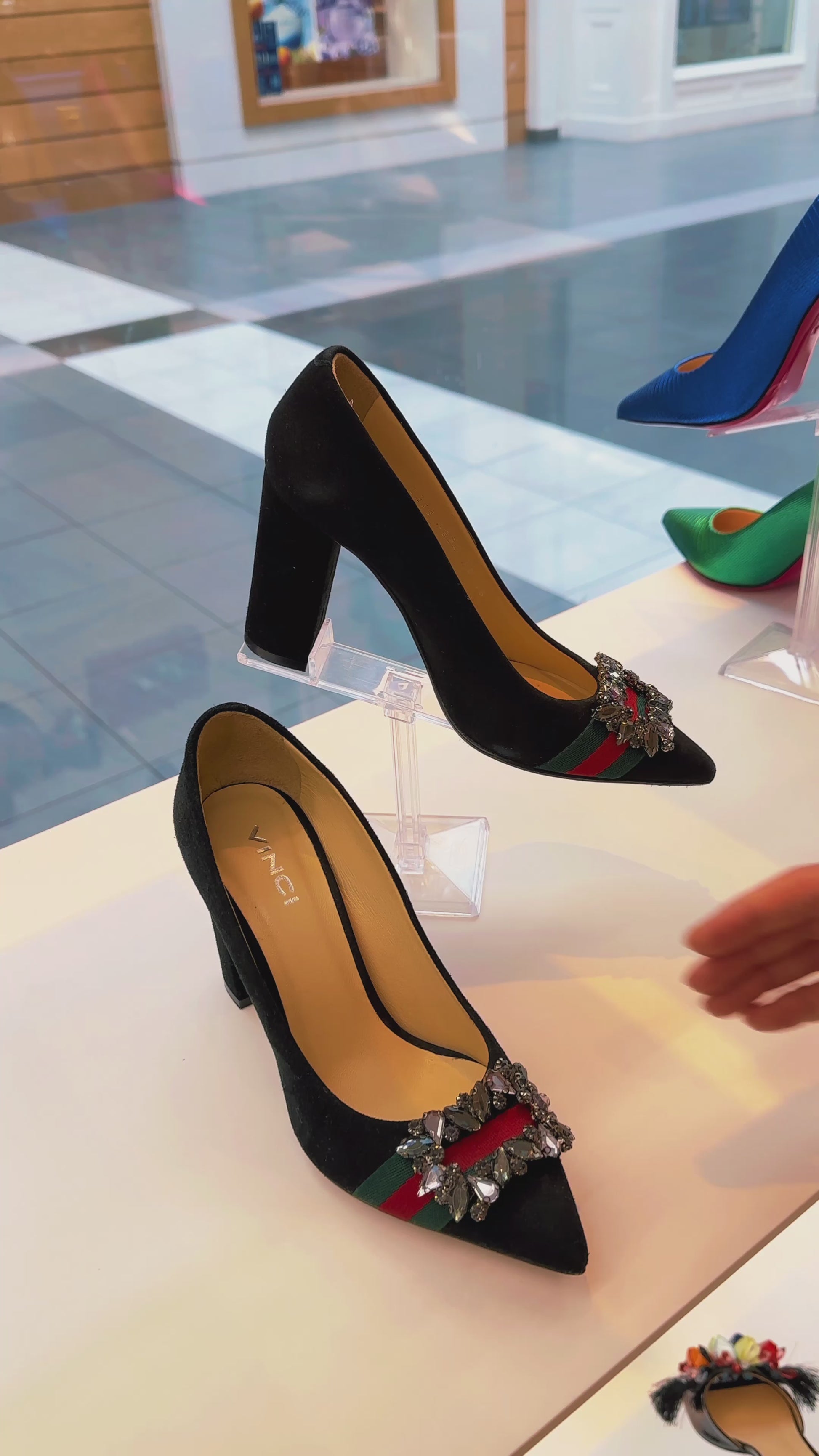 Harmonious Fabric Detail: Adorning the shoe are matching red and green fabric stripes, with a complementary silver jewelry accent, adding a touch of uniqueness to the footwear.
