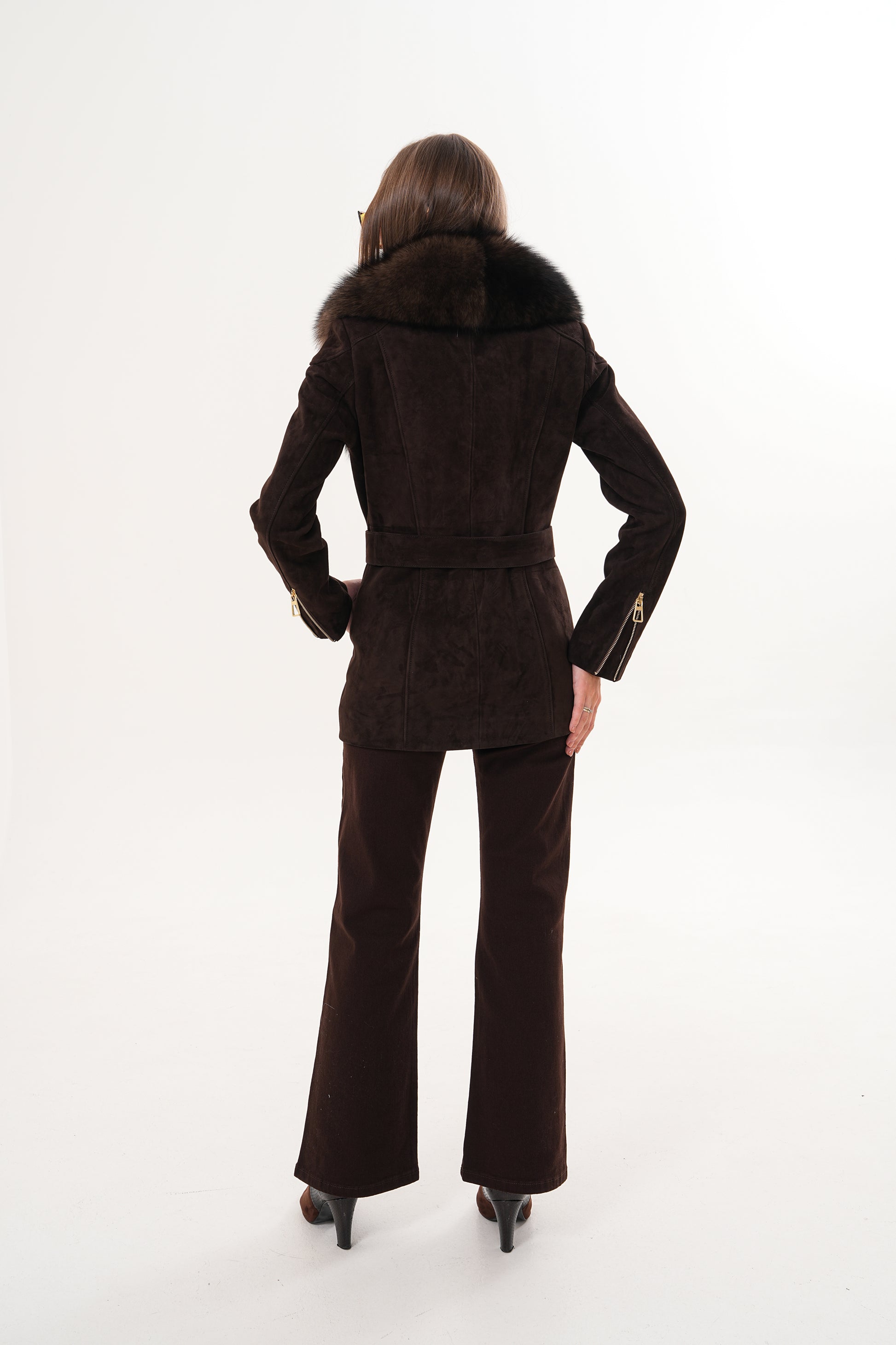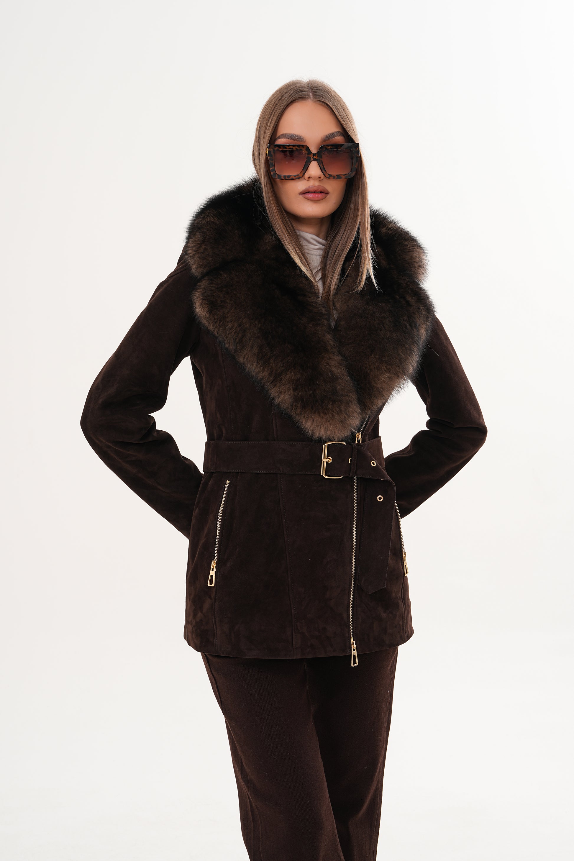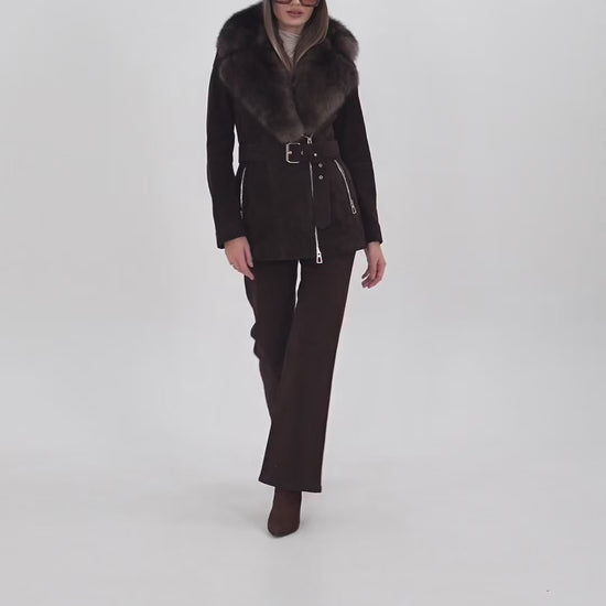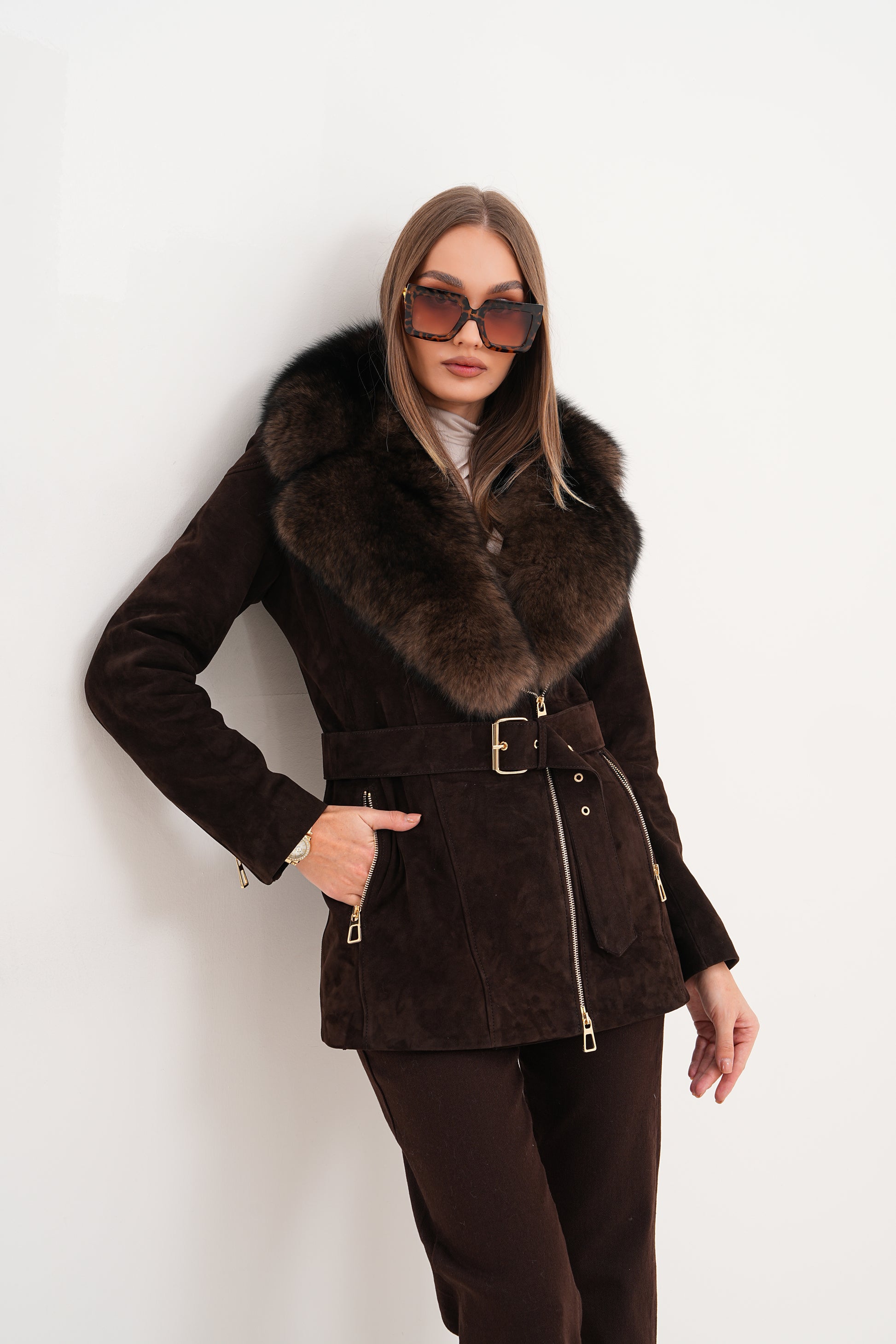 Crafted from luxurious suede leather, it features a stunning detachable fox fur collar that adds a touch of opulence to its modern silhouette.