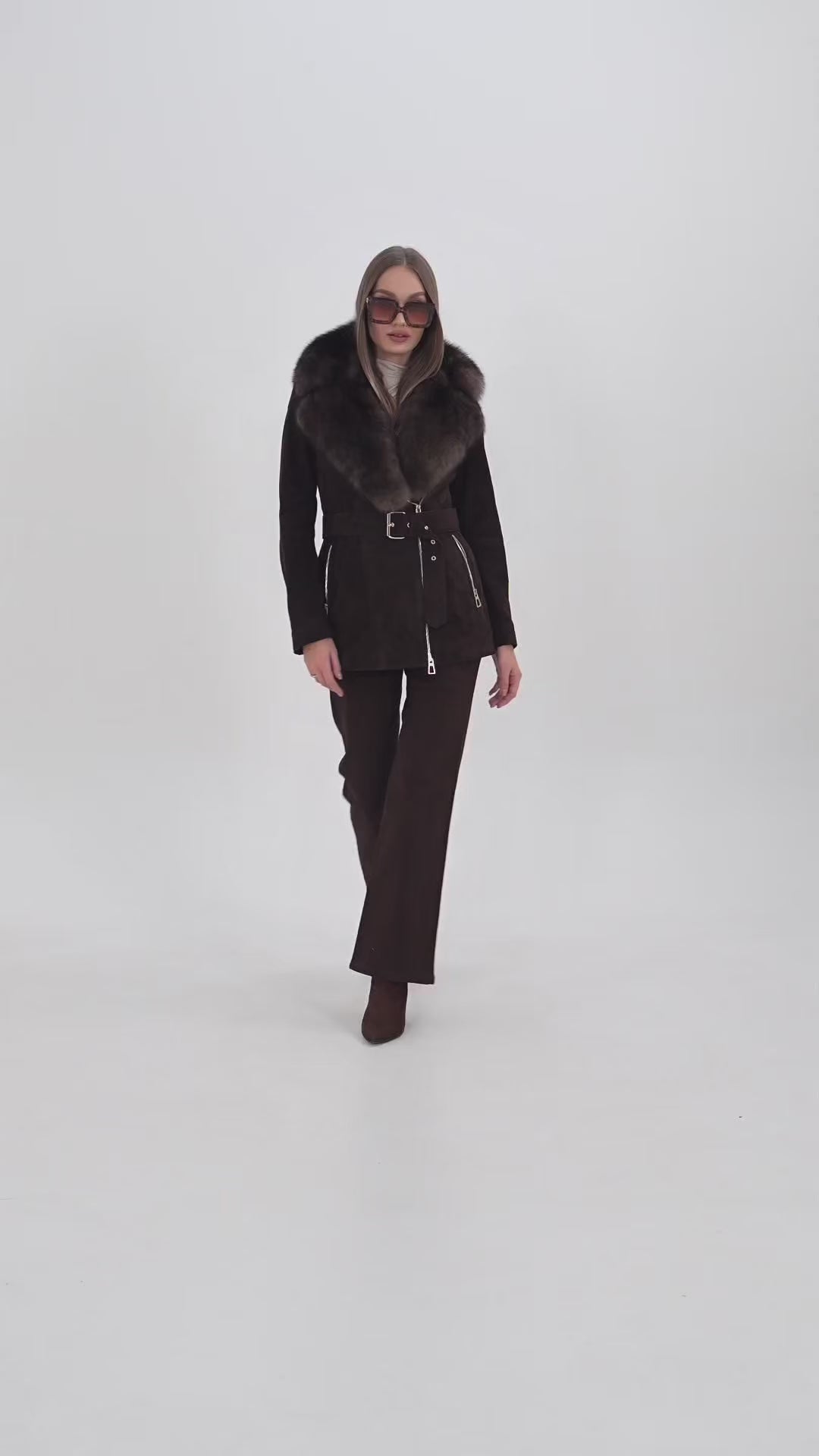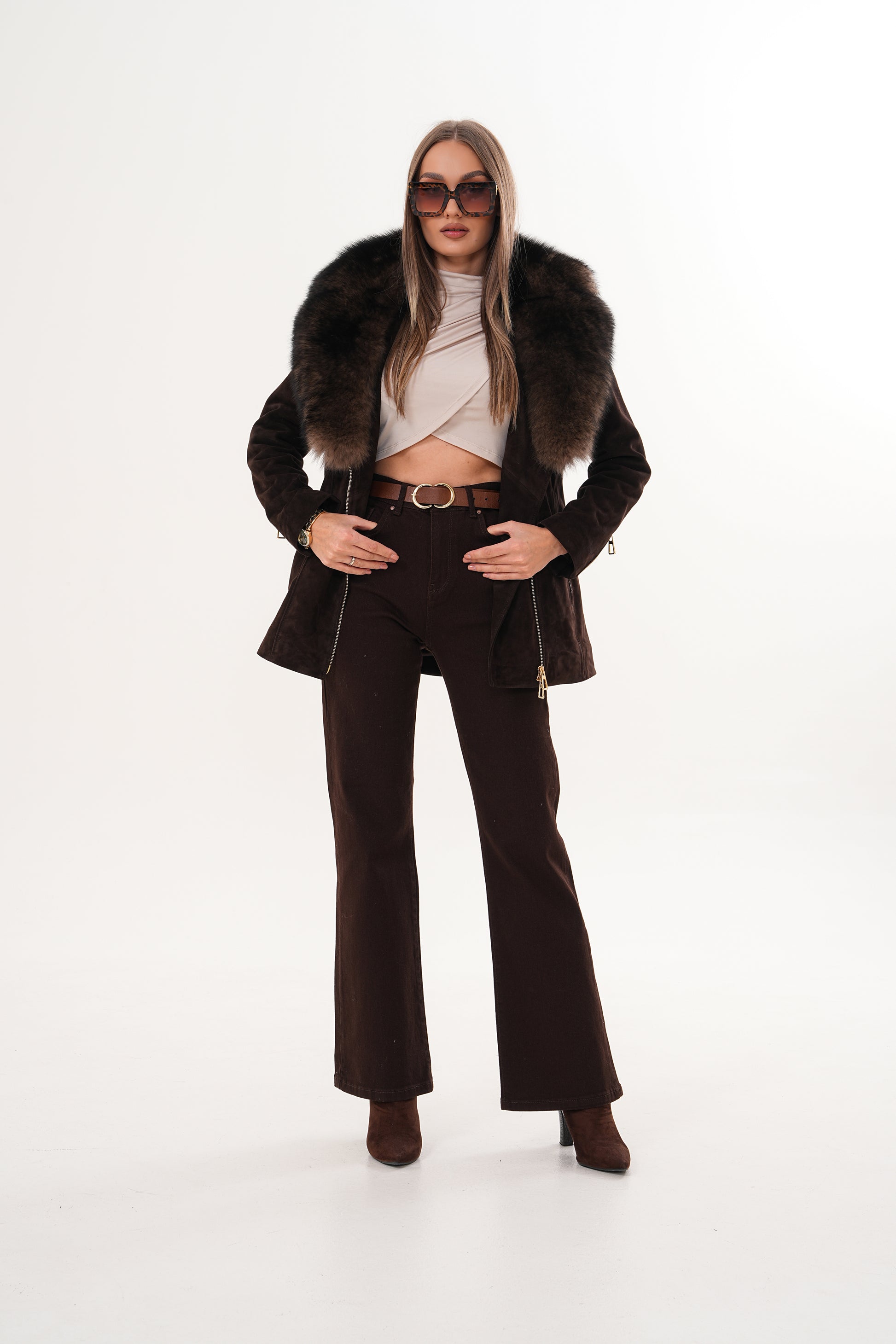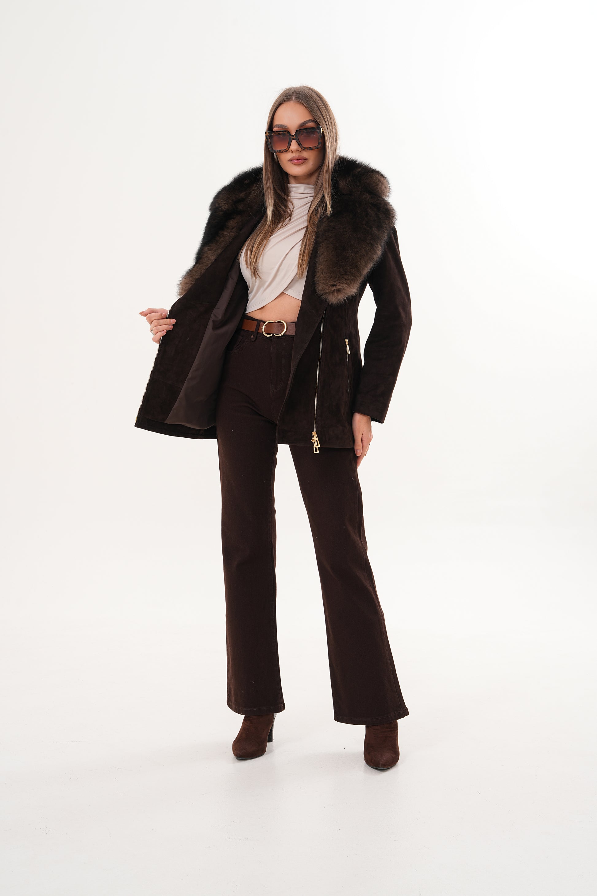 Crafted from luxurious suede leather, it features a stunning detachable fox fur collar that adds a touch of opulence to its modern silhouette.