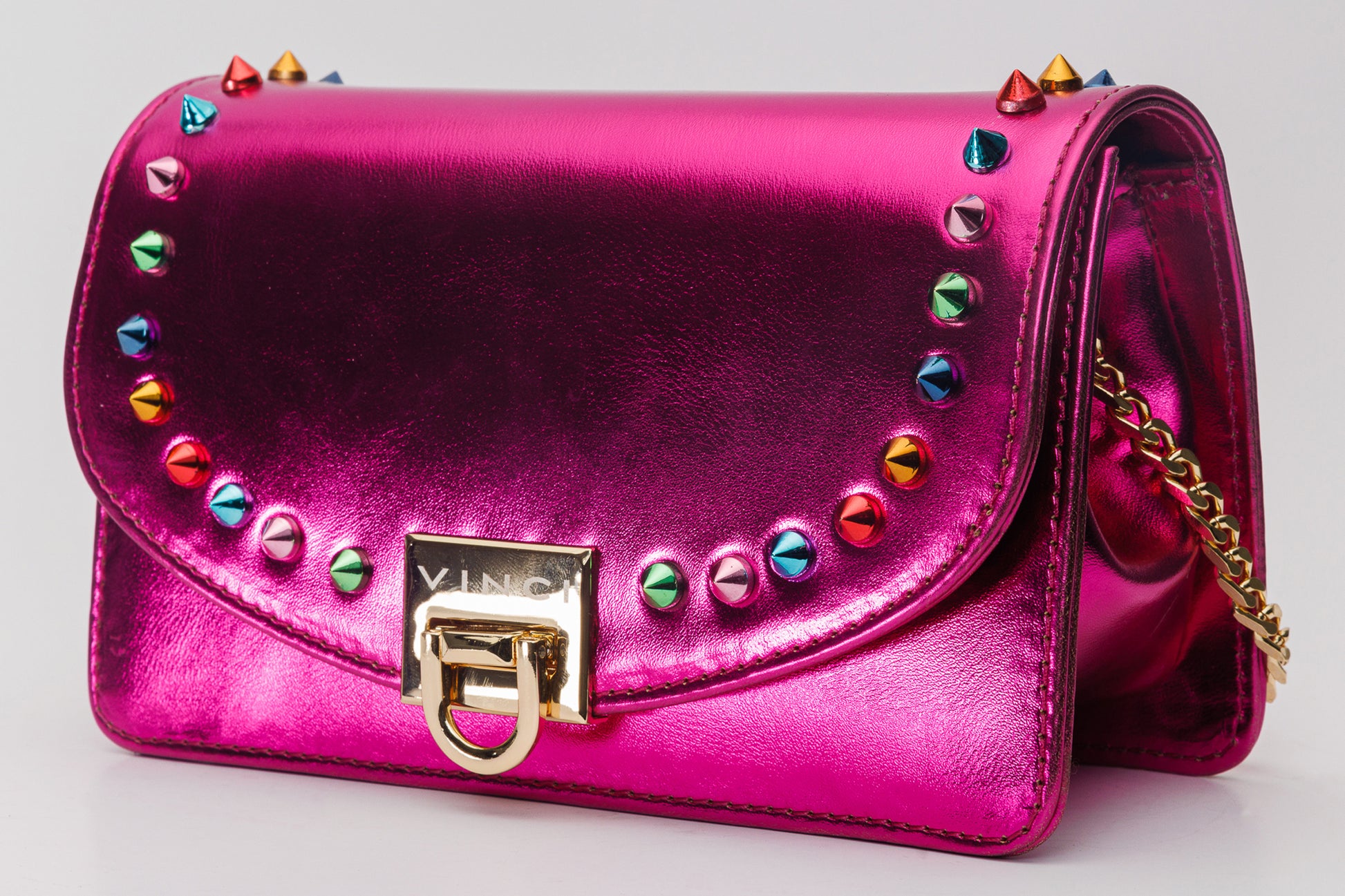 Caris Fuchsia Leather Handbag: Vibrant Elegance with Multicolor Spike Accents