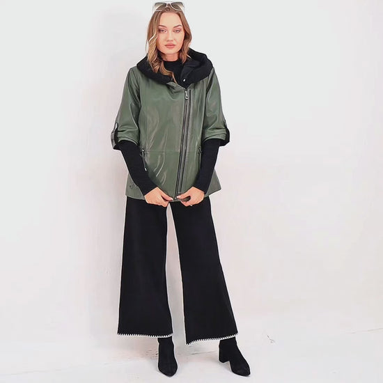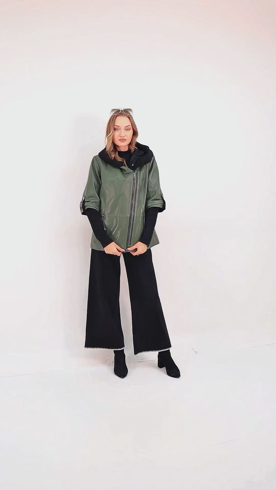 Color: Olive Green with Black Knit Hood and Cuff Details