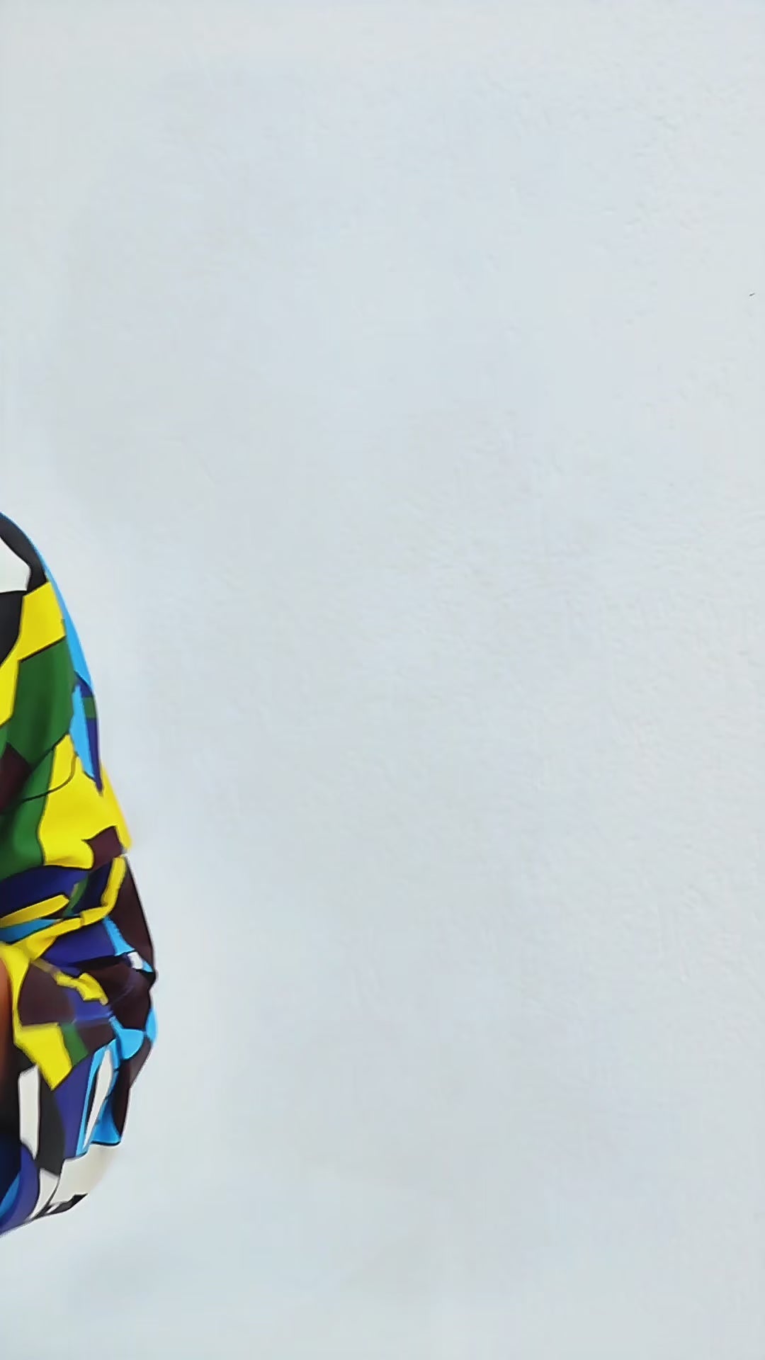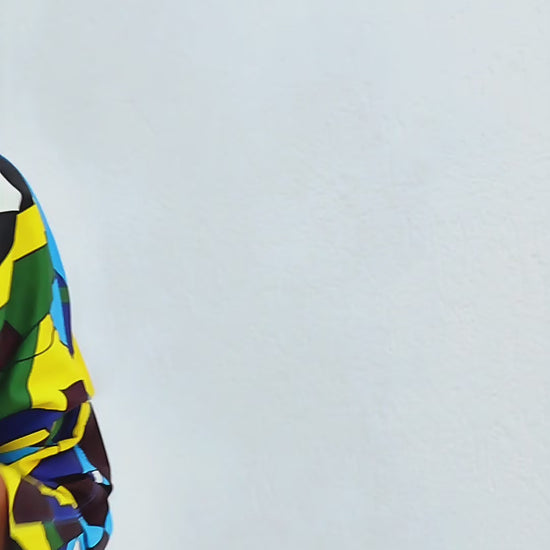 Exterior: 100% genuine calf leather, digitally printed with geometric multicolor patterns (featuring navy, yellow, green, blue, white, and black tones)