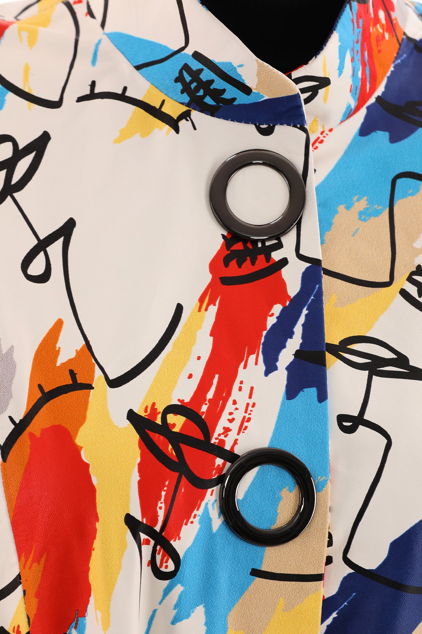 Exterior: 100% genuine calf leather, digitally printed with a multicolor abstract brushstroke and line-art pattern (featuring red, blue, yellow, black, and cream tones)