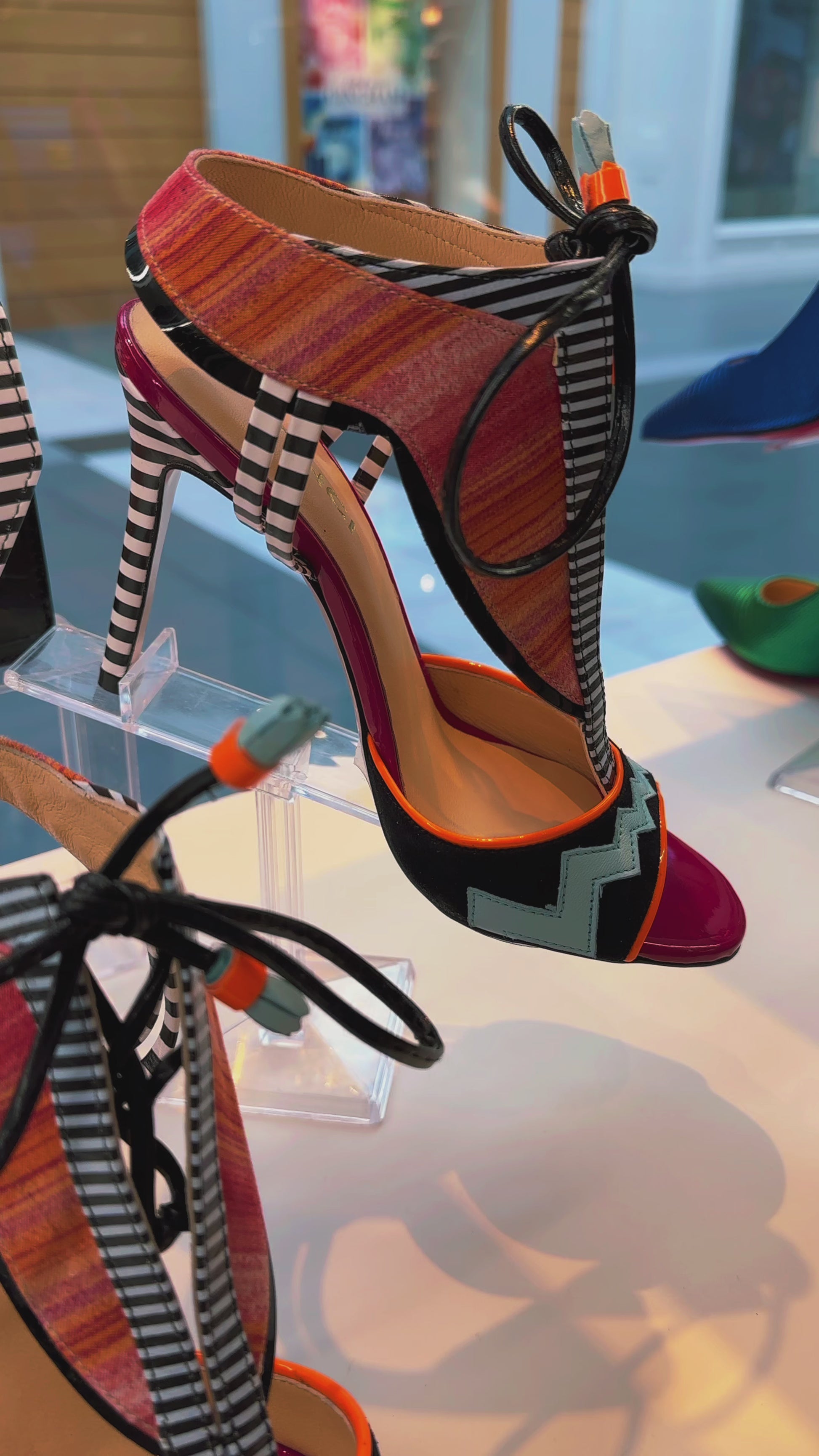 Multicolor Elegance: The T-Strap is crafted from a vibrant multicolor fabric, predominantly in pink, creating a visually appealing and unique pattern.